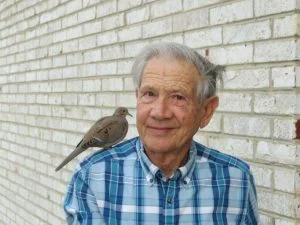 Last February, the dove on Charlie’s shoulder in the picture below, came to the bird feeder, as he was filling it with sunflower seed.