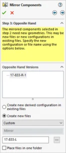 For mirrored parts, including left and right-handed versions of a component where both versions are used in different products with unique part numbers and independent lifecycles the recommendation is to create as individual files each with a single physical product configuration.