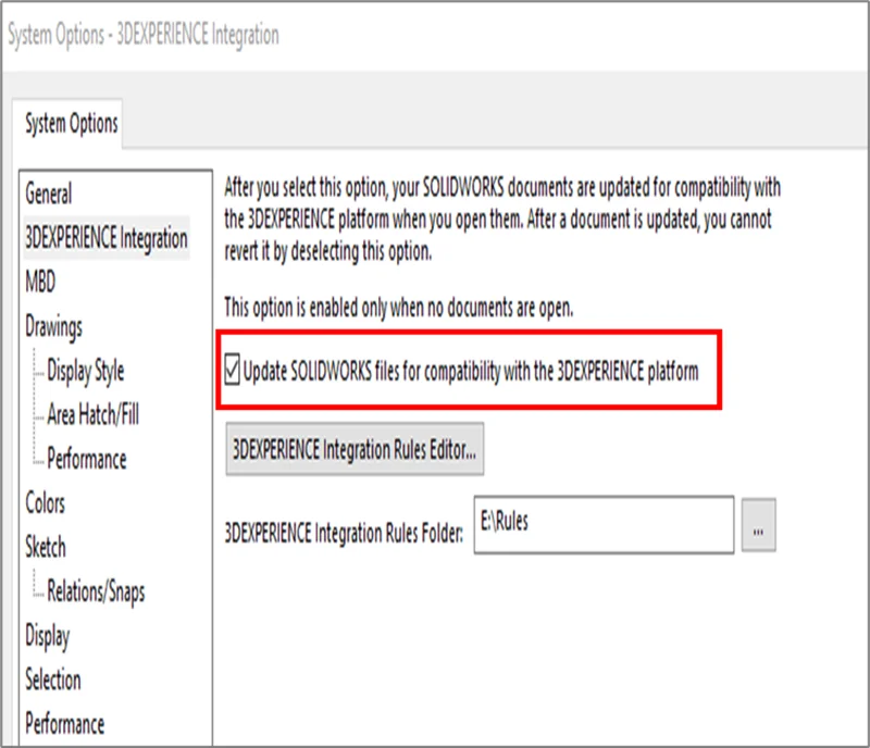 To manage the two different configuration types, the SOLIDWORKS option, Update SOLIDWORKS files for compatibility with the 3DEXPERIENCE platform, should be enabled for all users.