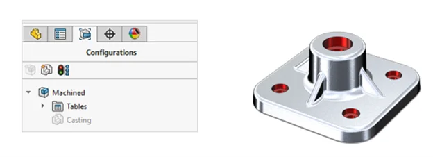 SOLIDWORKS configurations provide a simple and efficient method of capturing the cast and machined variations of a part. When working with the 3DEXPERIENCE platform, the required strategy will depend on the lifecycle requirements of each variation. If the requirement is to treat both as one part number, then it’s recommended that both the cast and machined variations are created as configurations in the same part file. This part file should contain only one Physical Product configuration.