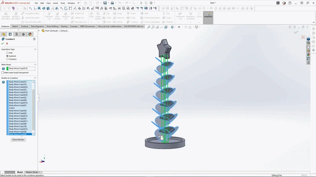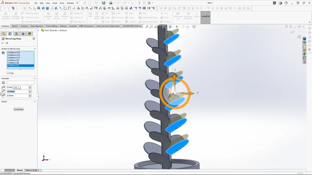 Using the linear pattern feature, I used the tree’s center post for the pattern direction, and used bodies, to select the leaf body to pattern. I applied 6 instances, spaced apart by 62mm.
