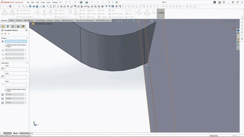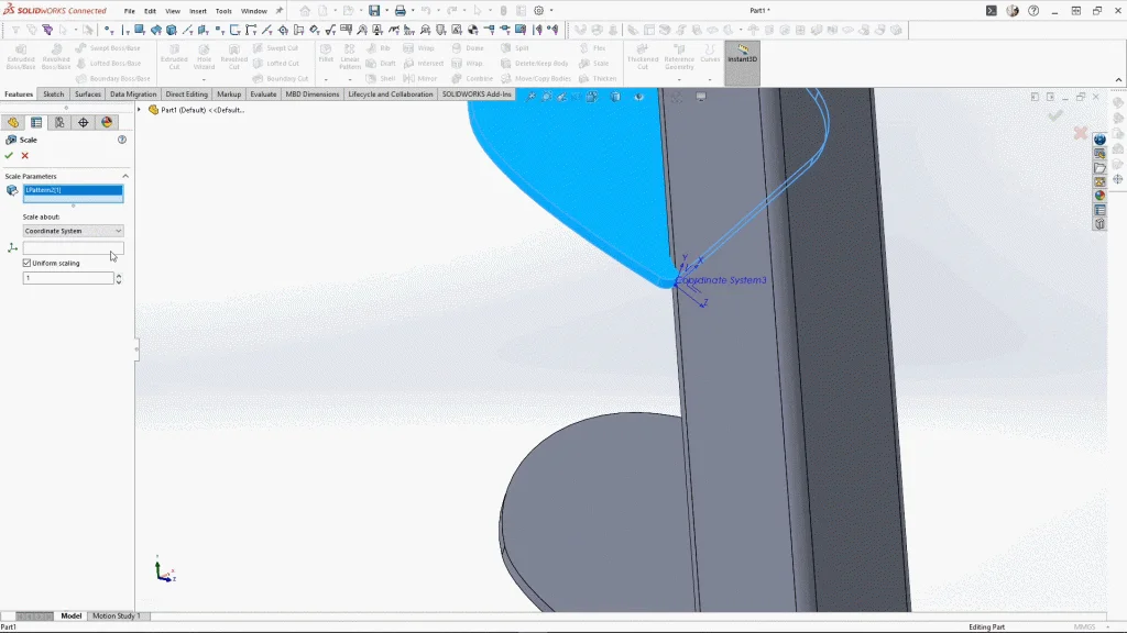 I attempted to use a variable pattern to enlarge the leaves as they go down, but it wouldn’t rotate the leaf, so I decided to try it a different way. So before I scaled up each leaf, I needed to add a coordinate system to each leaf. This will allow me to scale the leaf by a specific point of the leaf. Under reference geometry, I selected coordinate system, and starting with the 2nd leaf down as the first leaf will remain the same size. I could select the corner point of the leaf, and then select edges for the X and Y axis to attach to. Once applied you should see the visible coordinate system. If you can’t see it, you may need to toggle the view on under the view options. I repeated this process for each leaf.
