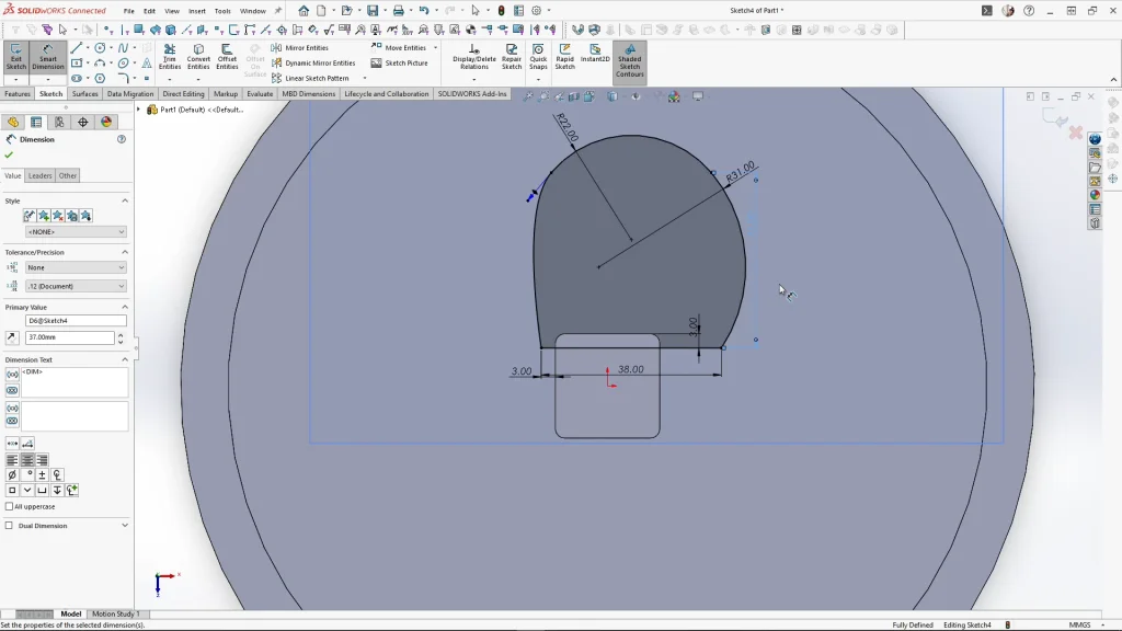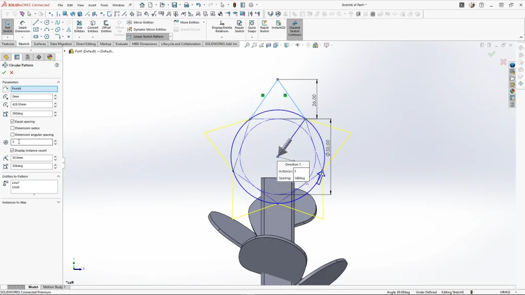 Skipping to the leaf sketch, I have my base part modeled in a SOLIDWOKRS Part file, selecting the top face of the tree post extrusion, I added a new plane 50mm below the face, flipping the offset. The shape of the leaf  is very important and must be sketched correctly otherwise, when I start patterning the leaves they will overlap each other. The leaf sketch also needed to overlap the center post as the leaves will slot into the post. Ensure you fully define your sketch and add all of the tangent relations between the two arcs and the spline. The leaf was then extruded by 2mm, unmerged, keeping the bodies separate.