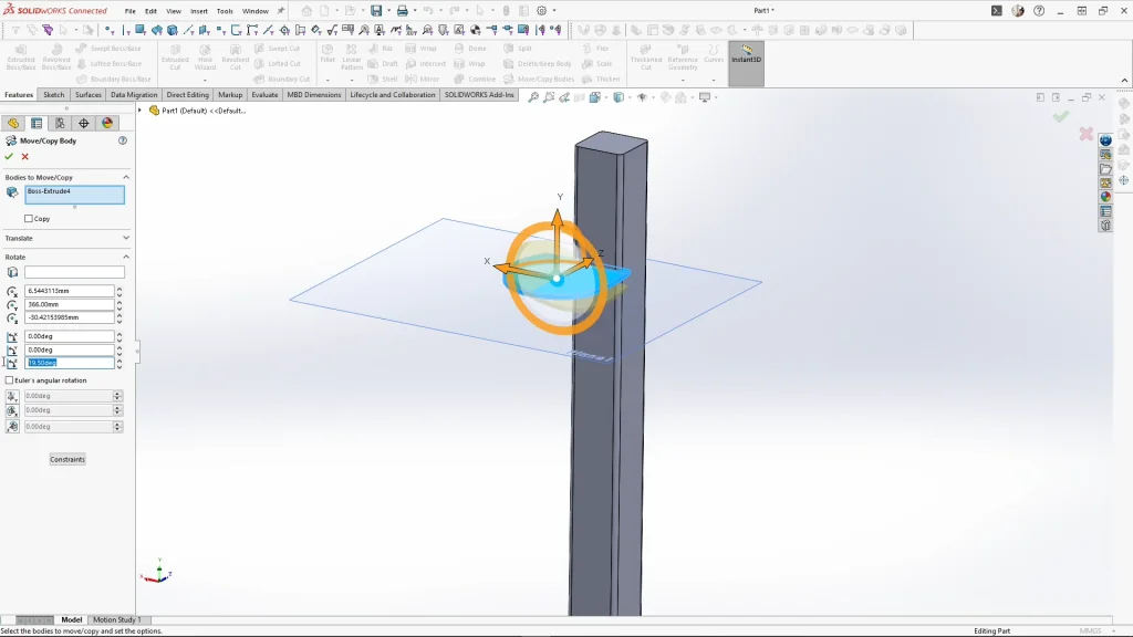 When applied, I needed to add features to make the part look how it should if it was made out of wood. To do this, I used the move/copy body feature to make 1 copy, this time of the post and all of the leaves. Using the combine feature, with operation type on subtract, I selected the star part as the main body, and the post as the body to subtract. This cuts away the post’s body copy away from the star. Then for the second combine feature, I used subtract again, selecting the post part as the main body, and then one of each leaf copy for the bodies to subtract, and applied it. You’ll then be able to see the slots cut into the post like below.