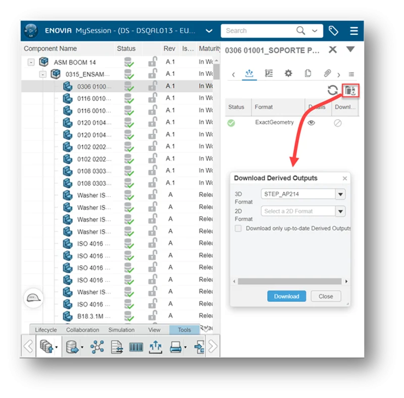 Download all derived output files for parts in an assembly from the Download Derived Outputs tab in MySession.