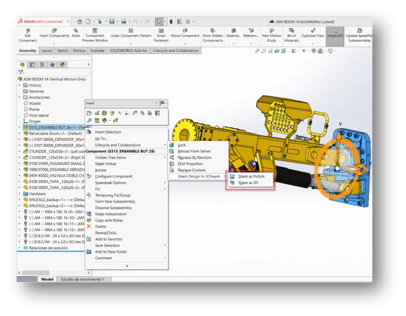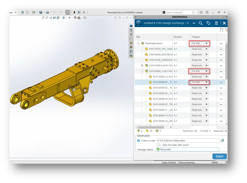 When 3DEXPERIENCE SOLIDWORKS users save a flexible assembly to the platform, the assembly will now be displayed in the exact same position when opened in other 3DEXPERIENCE authoring apps like xDesign and xShape. For example, if you have a flexible assembly like the hydraulic arm pictured below and you move that assembly into a different position and save it, when you open it up in xDesign, you’ll be able to see the assembly in the same position as saved from SOLIDWORKS.