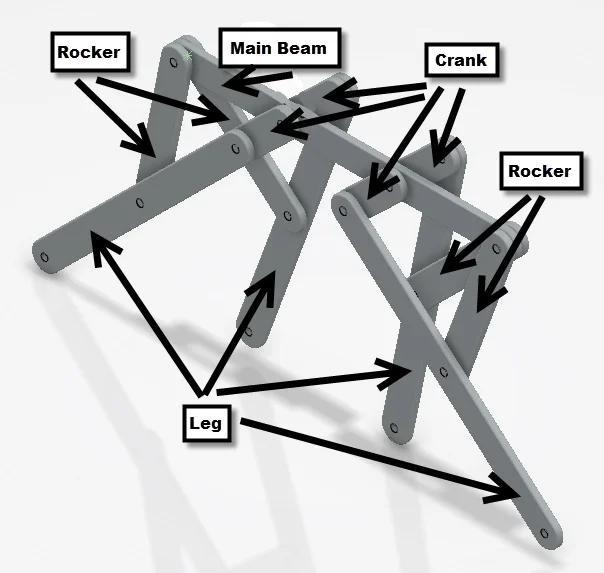 Stage 2 (Right Half): The right half of the machine is a close copy of the left half. The cranks for this half are parallel to those of the other half, and the rockers are mostly in line with their counterparts on the other side. When animated, the semi-circular pattern traced by the ends of the legs becomes evident, and the plantigrade motion is shown.