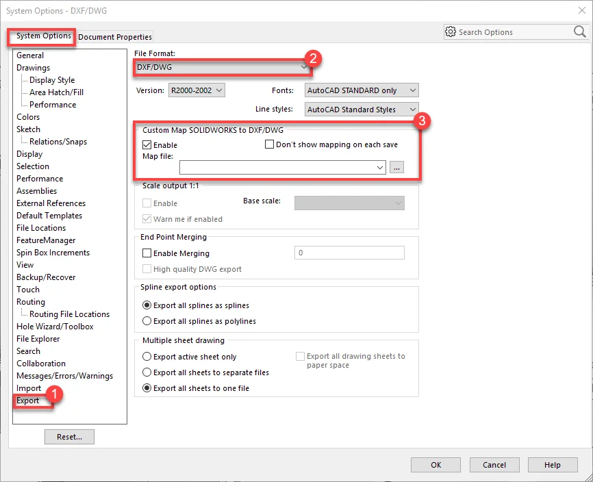 The first step is enabling the map file and setting up the correct map file to use. To edit the DXF Export Options, a file needs to be open. With the file open go to Tools – Options – Export – DXF. In the DXF export options we can also control the output version and the spline handling, but we are interested in the map file. Tick Enable.