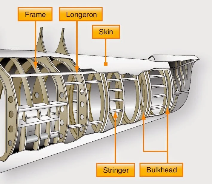 We’ll follow the same rule with the Belly Racer and minimize the weight and use aluminum T-6061 for the majority of the chassis design. Steel will be used for critical components such as the roll bar and surrounding driver protection which will be integrated into the chassis design. The design of the Belly Racer chassis will be comprised of Bulkheads, Stringers, Longeron and the Skin. Here’s a good image showing what these components look like.