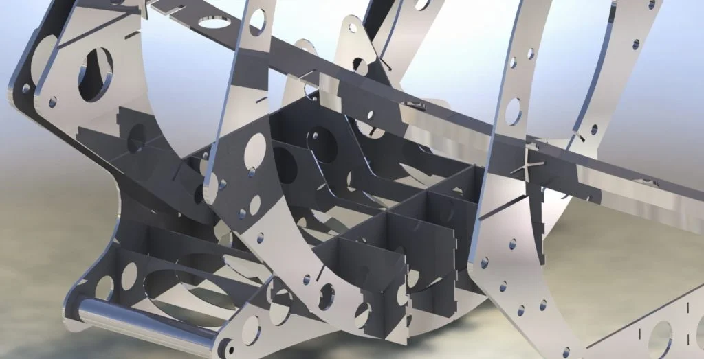 Assembly and welding will need careful planning because of the way each piece fits together. Here’s the front suspension main bulkheads and stringers, which shows the tabs and slots used for the self fixturing in this exploded view.