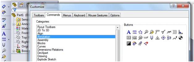 The other day while watching a video on some of the new SolidWorks 2013 features, I noticed that one of the Flyout Toolbars for Annotations had a command for Cosmetic Threads that I did not have in my Flyouts, so I set about going to find out how to make the same change. I looked in all of the standard places first, Help, Knowledge Base, etc. and found no real straight forward answer. So I resorted to my other bag of tricks, below is what I found and I think I will add this to my other collection of Redneck Workarounds.