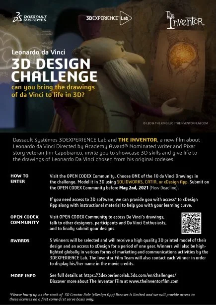 For this challenge, Dassault Systèmes 3DEXPERIENCE Lab will be partnering with Academy Award nominated writer and Pixar story veteran, Jim Capobianco. One of the five challenge winners will have the chance to be featured in Jim’s new film The Inventor, a film about Leonardo da Vinci. In addition, winners will receive a 3D print of their design and access to our latest cloud apps in the 3D Creator Role. Which in turn give you access to the SOLIDWORKS xDesign App, for one year at no cost.