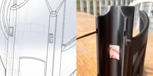 During the initial design process I was debating on a few different ways of attaching the bottle mount to bike. After researching different DIY alternatives to bottle cages, I ended up deciding to go with a combination of two methods: I utilized zipties to attach the mount, followed by adding a small square of double sided mounting tape placed in a recessed area, to prevent the bottle mount from sliding or turning on the bike frame.