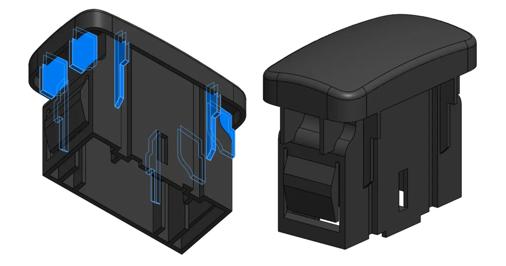 The last thing to do is to apply additional thin extrudes, cuts and chamfers for the outer fins, pictured below on the left. And now, the reverse engineering of the blank insert is complete!
