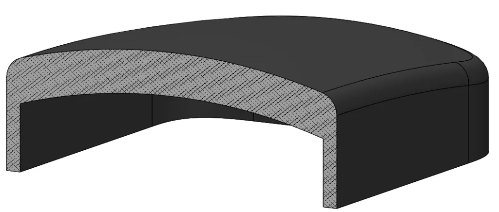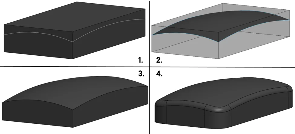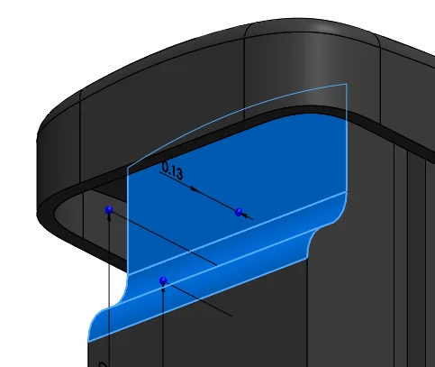 I decided that the top part (the part that faces the user when inserted) would be my base feature. In image one below, I started with a rectangle with the proper length and width and extruded it a little bit further than I needed to so that it was overbuilt. Next, I used the sides of the rectangular prisms to start sketches on each side that have circular arcs, the most measurable part. (See image two.) The sketches give me just what I need to loft a surface. The result is seen below, in image three, compared with the transparent rectangular prism for demonstration purposes. A quick replace face with the surface renders the result I need. A couple of fillets later and my model, shown in image four, is already starting to look slick!