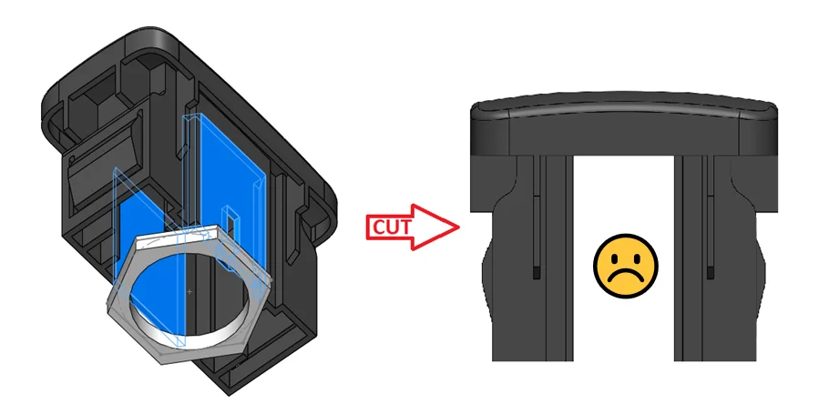After I gather all of the dimensions of the button, making a button-shaped recess was easy! I performed a series of cut extrudes and finished it off with a fillet for a smooth appearance. But now comes the question of how the button will stay in place. And that’s where the first problem lies. The button uses a nut that screws in from the back, and it’s so large that it will not fit within the walls of the bottom of the insert. One option to give it space would be to cut away a bunch of material, but that will make our new model very flimsy.