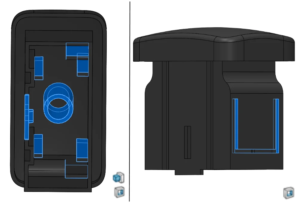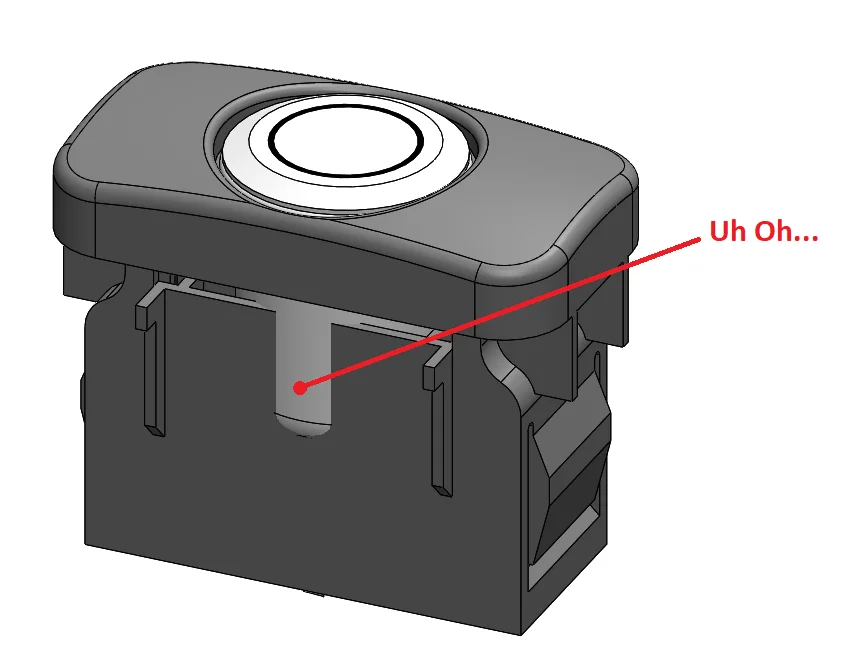 Now that the retention issue is solved, it’s time for a test fit with SOLIDWORKS. Here is the assembly with the button pushed into place. Another problem is immediately apparent. The gray area protruding from the side is part of the button, and it’s interfering with our insert.