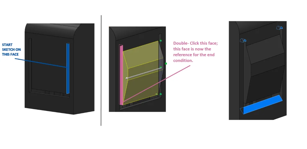 Here’s a tip for improved speed when modeling: start the sketch for the bump on one side of the tab. As soon as you boot up the boss-extrude, double click the opposite side of the tab, and the command will intuit that the face you double-clicked is the “Up To Surface” end condition reference. After that, just accept the command. Boom, the feature is done! A couple of Full-round fillets and a chamfer later, the tab is mirrored to the other side.