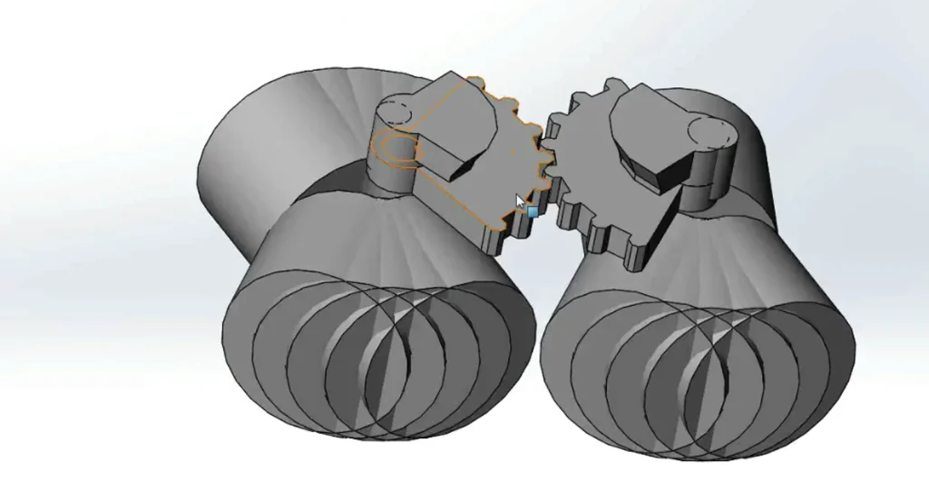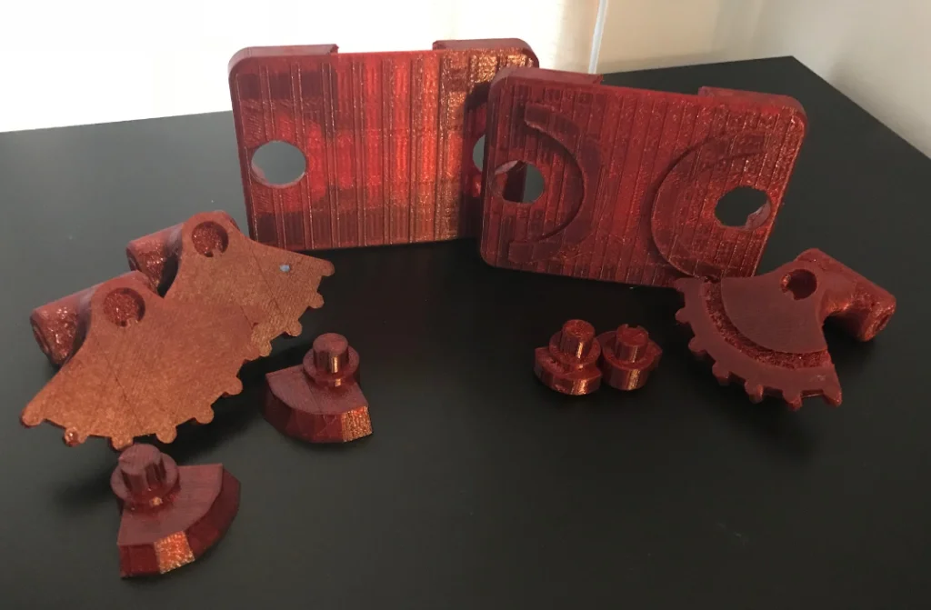 The first version we printed didn’t work too well. The tolerances were too loose and the axles wobbled a lot. So we added some slots to to the gears to make them more stable. We printed this new version and it worked out great. The version on the left is the first version and the right is the final version.