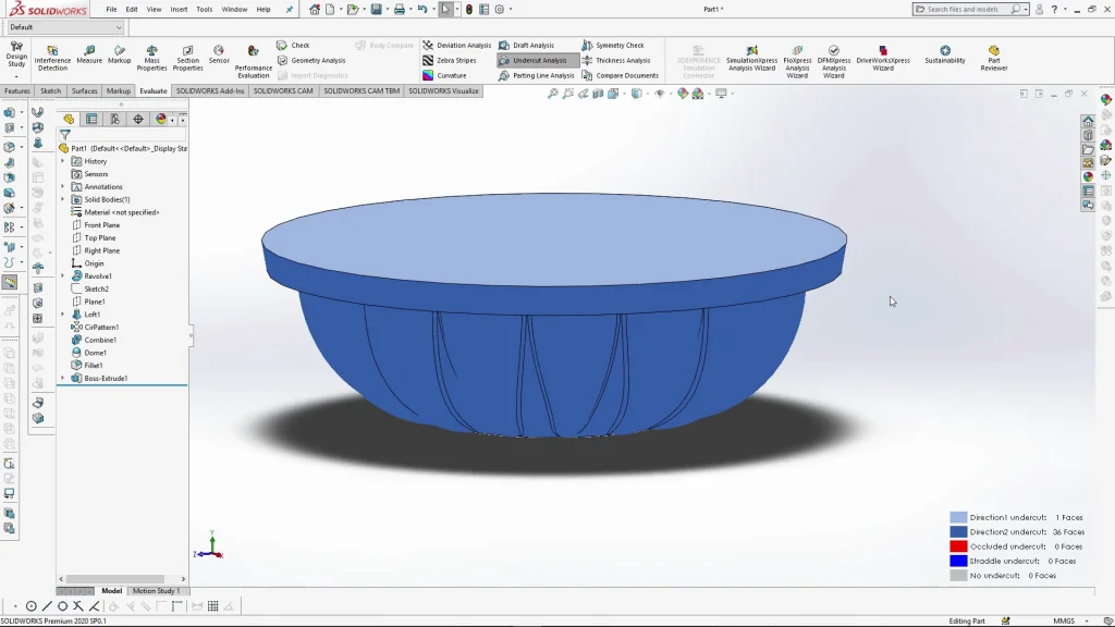 The undercut analysis can highlight any issues on the model by shading the issues in red and appearing in a key as you work on the part, It is a very easy tool to use and understand for one part molds. Once the bowl model is complete, boss extrude and the combine and subtract tool is used to create the mold. An animation of the final mold can be found at the end of the tutorial. the animation was created with an exploded view, animated in motion analysis and exported to SOLIDWORKS Visualize for rendering.