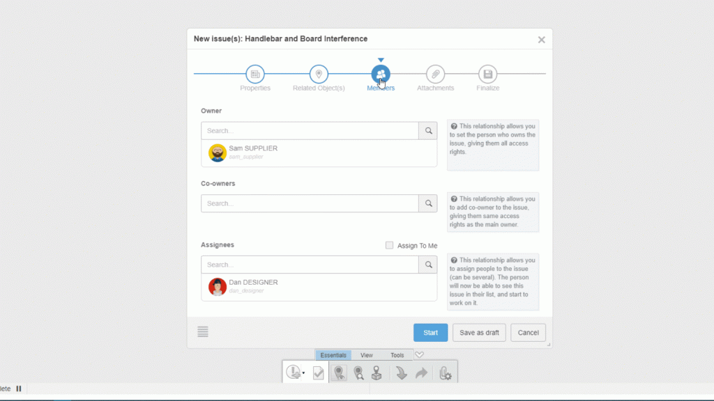 The next step is to attach the issue to the affected part, which can be done directly on the 3D model itself! After the rider platform is selected, any reference components which might need to be reviewed are included. These references are critical to understand in case any re-tooling needs to be considered when reviewing the issue and ordering any required changes. Sam makes sure to include all of the appropriate team members as well to make sure everyone is aware of the interference concern.