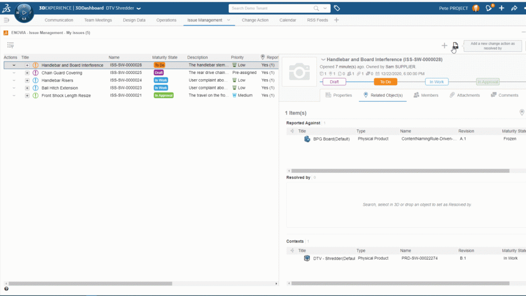 Turning over to Pete, the team’s project manager, we see his dashboard showing all issues, their status and where they reside within the current assembly. The newly submitted ‘handlebar and board interference’ flag shows that it’s in a new ‘To Do’ issue. Pete get started to further investigate the problems’ severity and any downstream implications to the project’s completion.