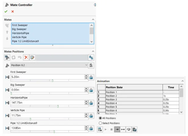 The SOLIDWORKS Mate Controller is the perfect tool for a beginner at animation. Once you have selected your mate type you simply define “positions” for each mate type and determine how long each position will last for. SOLIDWORKS will calculate the path your parts will take from one position to the next.
