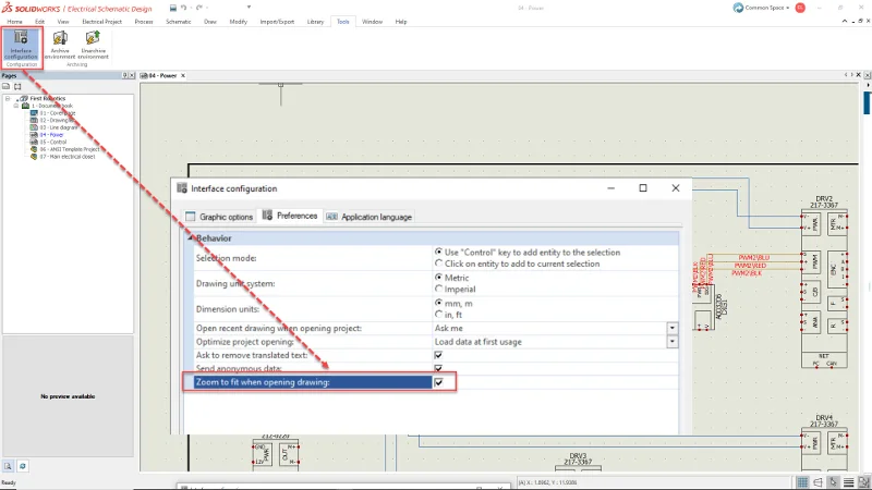 Save schematic editing time with a new Zoom-to-fit option in the Interface configuration menu: “Zoom-to-fit when opening a drawing. ” This option automatically zooms to fit any schematic drawing you open to the full-screen size.