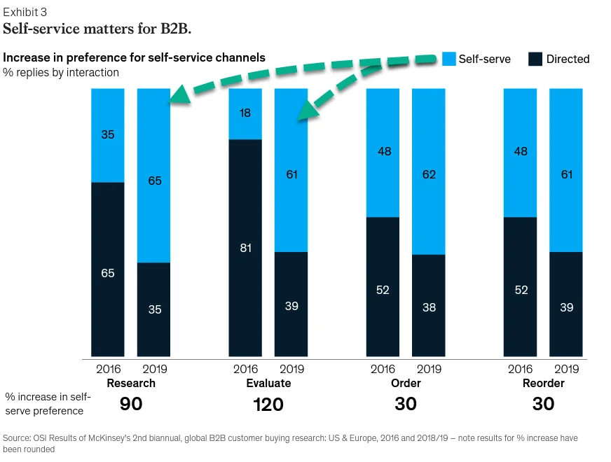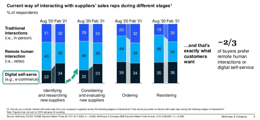 You bet! Actually, it’s not only awesome, but also vital to elevate your digital presence. According to a multi-year research by McKinsey from 2016 to 2021, buyers spend significantly more time in digital self-serve channels before contacting venders, as shown below at the lower left corner in the chart. Did you notice that the over-10-point shift happened in merely 6 months from August 2020 to February 2021?