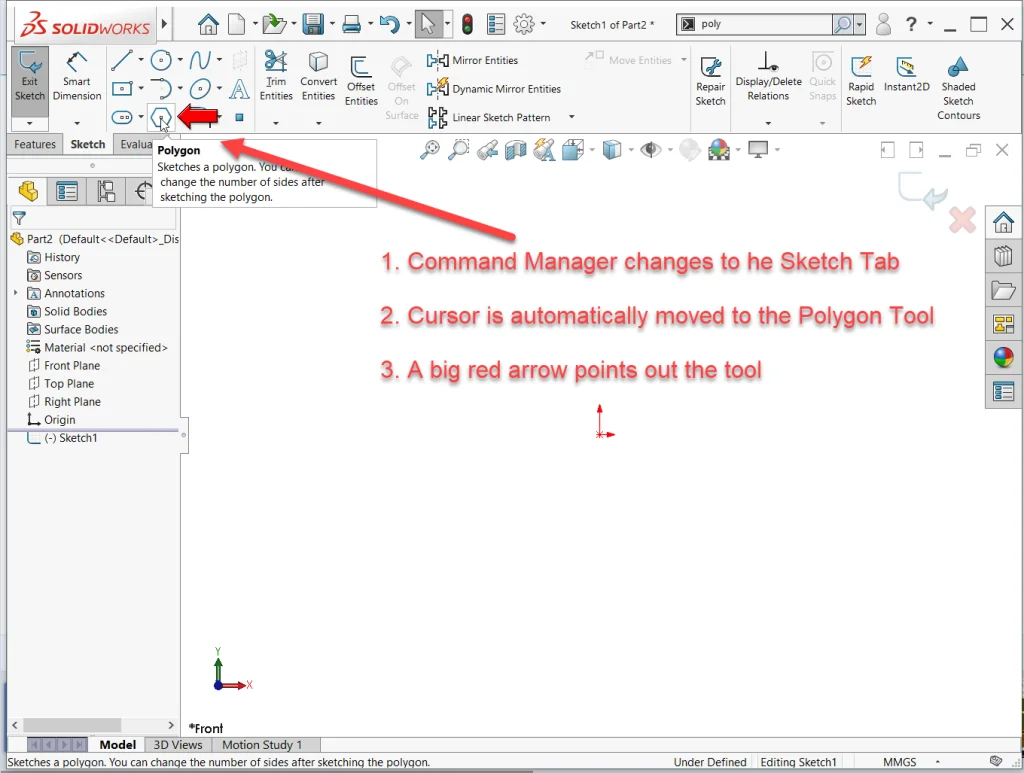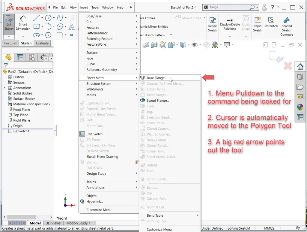 If there is no toolbar or CommandManager tab open with the command button in question, SOLIDWORKS will instead expand the dropdown menus to reveal the command, automatically move the cursor over the command, and then display a big red arrow pointing it out.