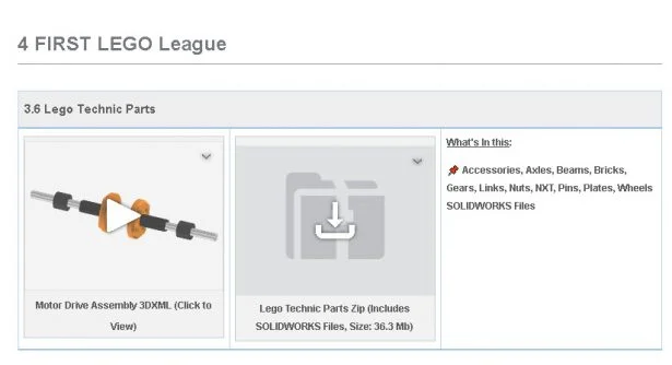 For SOLIDWORKS Lego models, signup for the free student community go.3ds.com/studentcommunity – select Wiki (green button) – select FIRST and download the Lego components. You will need to create a 3DEXPERIENCE ID (Login).