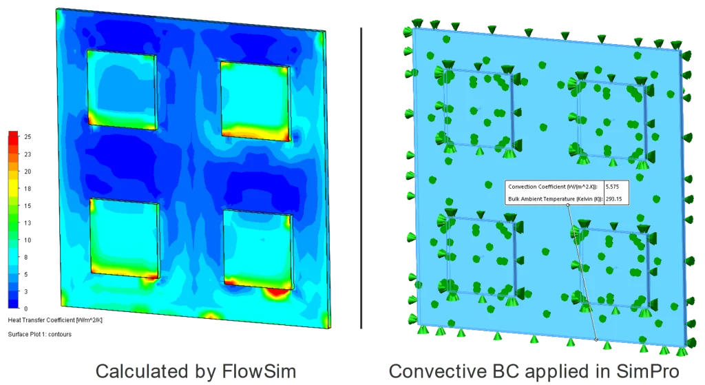 Image 4: On the left, Heat Transfer Coefficients [W/m2K] calculated for an external free convection problem solved by Flow Simulation, and on the right, a convection coefficient of 5.575 W/m2K applied as a BC on all external surfaces in Simulation Professional.