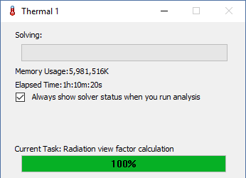 When it comes to Radiation heat transfer, the capabilities of both Simulation Professional and Flow Simulation are the same at face value, but in practical usage is carried out differently; both are capable of doing solar/ambient radiation as well as body-to-body radiation.  What ratio of thermal radiation an object “sees” (i.e. view factor) at its surface depends solely on geometry; think of sitting behind a tree in the shade during the daytime as opposed to out in front where the sun is shining.  The way that Simulation Professional solves for the radiation view factor is by doing the calculation upfront before solving for temperatures.  It entails a massive geometry problem of the contribution of each outwardly facing element face to every other element face participating in radiation; so because of this it is recommended to have a fairly coarse mesh in Simulation Professional that includes radiation, otherwise you could wait for a long time for the view factor calculation itself to complete, see Image 6.  For the same model and mesh in Simulation Professional, it takes only 5 seconds to solve a problem with convection cooling, but when surface-to-surface radiation is included, the solution time took 147 minutes total with the view factor calculation taking about 70 minutes of that time; that is an increase of over 1750x in total time where view factor calculation uses 48% of that time.  [Note that once the view factor calculation is performed, as long as mesh doesn’t change then it doesn’t need to be run again, for example if you want to test out a different power input.]