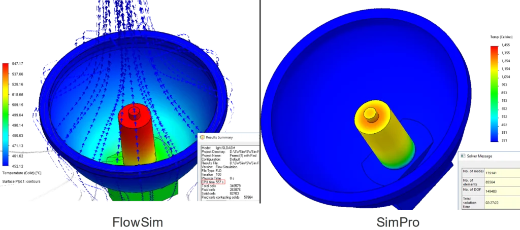 The results for a conjugate heat transfer test “Lamp with reflector” model are shown in Image 8, where all three heat transfer modes were used in the solution.  The time to solve the model in Simulation Professional with 85,564 elements was 2h27m22s, and for Flow Simulation with 82,703 solid cells (and 346,579 total cells including 263,876 fluid and fluid contacting solid cells) was 9m17s.  With the size of the mesh being roughly equivalent, the Simulation Professional solution took nearly 16x longer to solve. The difference in time for solving a sample problem in Flow Simulation including radiation versus without was 1m48s longer, representing only a 24% increase.