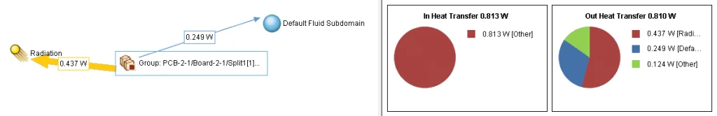 Image 10: Flux plot of heat leaving the PCB due to radiation and conduction and convection to the surrounding air fluid; a pie chart shows that radiation accounts for more than 50% of the heat transfer out.