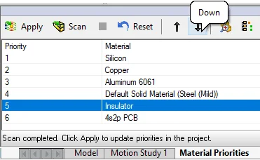 Image 12: Material Priorities dialog in Flow Simulation; the Insulator material was manually moved down to fifth position.
