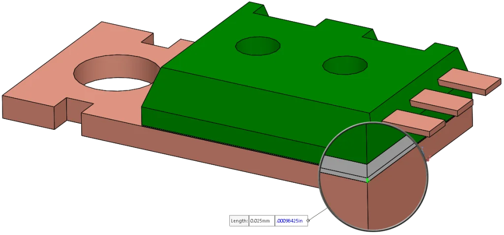 If you already read the first post in this series, you’ll recall an example regulator microchip problem where the different mesh schemes was briefly mentioned to be covered in part 3. Simulation Professional uses the finite element method (FEM), where the mesh elements need a defined connectivity between its nodes and an element has to be constrained within a single body, which would seem to be a standard requirement. This single body requirement does become a limitation when applied to real geometry, where the overall size to thickness (or aspect ratio) is quite large. Zooming into the bodies between the large microchip at top and the copper heat sink at bottom, in Image 13, shows there are two layers of material in between. The thinnest part is only 25 mm thick but is 21.2 mm in its longest edge resulting in an aspect ratio of 848. Mesh controls in Simulation Professional are able to capture this body after the default mesh settings failed to mesh this part, as seen in Image 14.