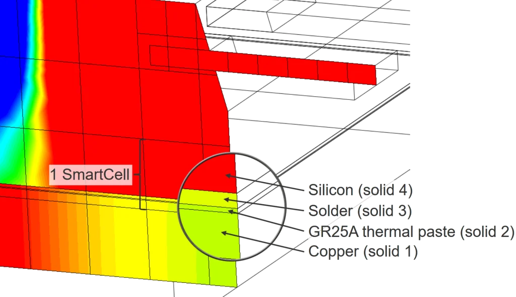 If you are a keen observer, you would had noticed that the temperature change accurately reflects the difference in thermal resistance based on a material’s conductivity. Also note in the mesh another instance of multiple body/material changes in the image at the top, where the connector protrudes from the chip; even if it was the case that the chip interfered with the copper connector, the material priority discussed earlier would handle the change in resistance.