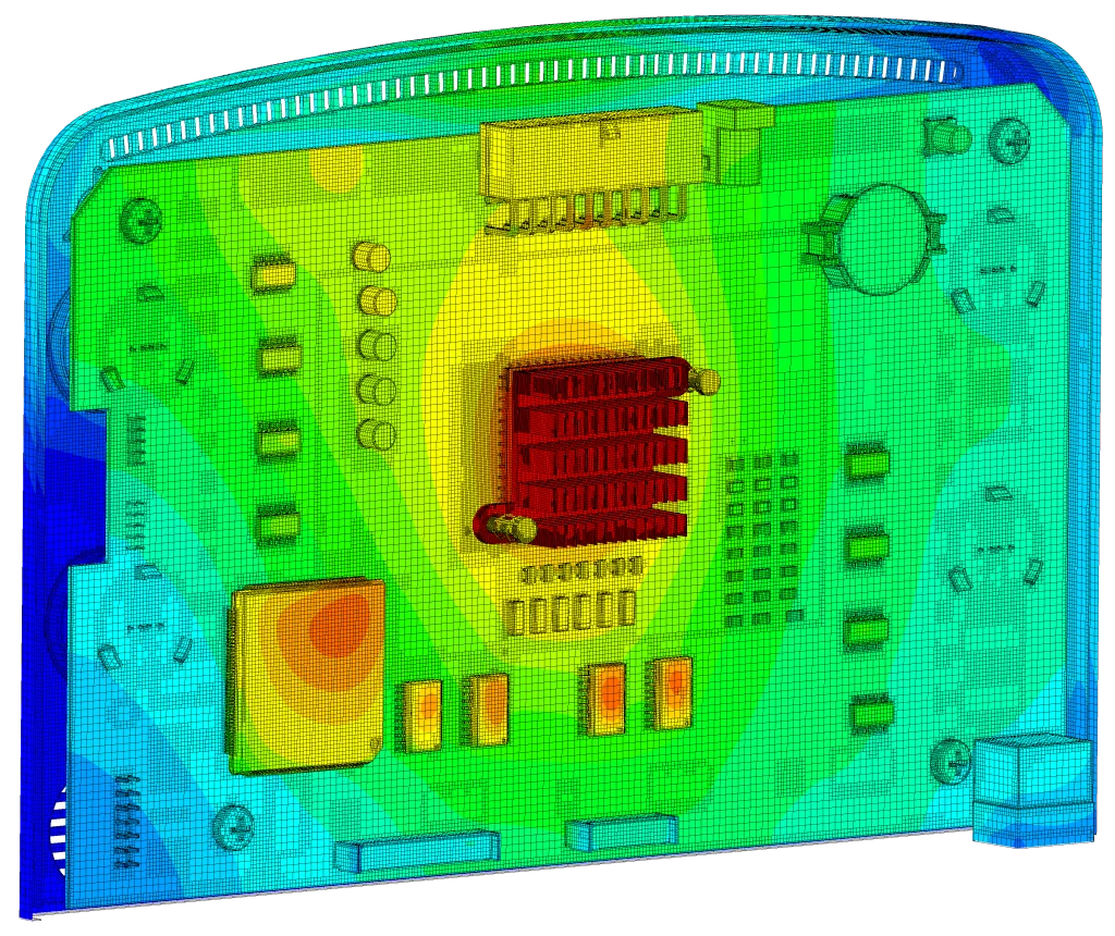 I will conclude this series of blog posts on this topic with a single image that encompasses all that I had hoped to express throughout in words: a full fidelity geometry; the irregular distribution of temperatures is emblematic of the realistic results having used all modes of heat transfer; and the mesh is both localized to the important geometry features and adaptively refined to the solution. In more simple terms, I simply recommend Flow Simulation by saying, “It just gets the job done,” without me having to worry whether it’s going to work or not.