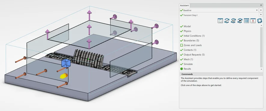 Similar to the SOLIDWORKS desktop simulation products, an assistant is available to guide the user through major setup considerations step-by-step, including defining the relevant physics and materials, setting up boundary conditions, and so on.