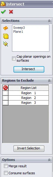 6. Note three regions are created.  De-select “Merge Result” in the Options group box since you do not want to combine the fill volume with the bottle itself.