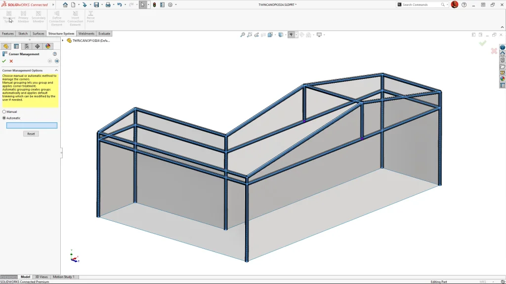 Structure Systems is the fastest way to build structures like this canopy. Corner treatments are much more streamlined with automatic corner grouping. Simple corners default to planar trim, and complex corners have much more sensible treatments from the start.
