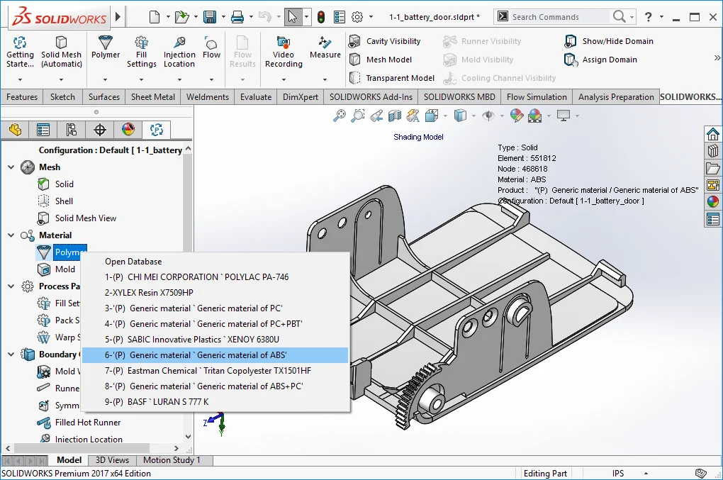 Step 2: Show the Plastics tab and create a Solid or Surface mesh. Tip: Use Solid mesh when the thickness varies widely or when accuracy is important, use a surface mesh for faster results and especially for parts with uniform wall thickness. Automatic mode will give you a good starting mesh, and manual mode will allow for simple refinement and feedback on mesh quality.