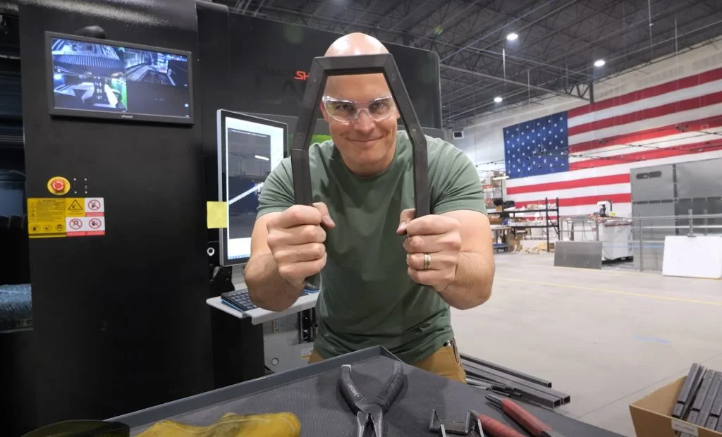 The manufacturing process for the Huckleberry Hiker begins with laser cutting steel tubing into precise shapes. Rather than cutting and bending pieces separately, kirigami is employed. This technique involves cutting slits into the metal, allowing it to fold naturally into place. This method is faster, cleaner, and reduces the needed parts.