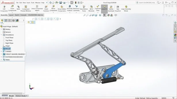Let’s dig into this new study by considering a simple example that I carried out recently. The model, shown below, is a simple gas assisted hinge lift mechanism, and the task is to refine the design of the blue component to reduce its mass while maintaining its stiffness.