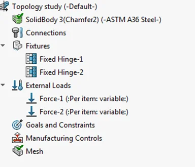 Creating a Topology Study is no different than a static study; the materials, loads and restraints are the same. What is different are two new inputs: Goals and Constraints and Manufacturing Controls.