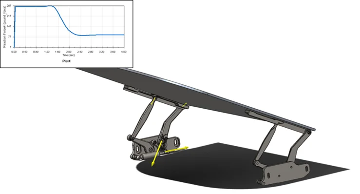 The first step of the design refinement process is to determine the loads the link will experience during the hinge operation. The current release of the topology study can only be applied to parts containing a single body, but the loads experienced by the link are due to the assembly motion. By carrying out a motion analysis on the assembly, the loads at the link connection points can be calculated and transferred to the part for analysis. The loads on the blue link are shown by the size of the yellow arrows in the image below and the maximum load on the gas strut.