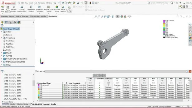 SOLIDWORKS Simulation includes a Load Case Manager, which is ideal for this simulation because you can determine the minimum mass component that meets all of the loads throughout the hinge operation.