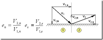 restitution coefficients which are ratios of the absolute value of the normal and tangential velocity components correspondingly after and before the collision:
