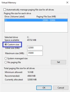 5. Under Custom size, enter the value double the size of the amount of physical RAM installed in your PC. (If you have 16GB, type in 32000MB)